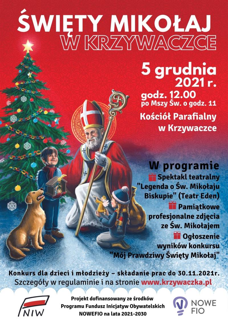5 grudnia po Mszy Świętej o godz. 11 w tamtejszym kościele odbędzie się finał konkursu z udziałem Prawdziwego Świętego Mikołaja. W programie również występ Teatru Eden i bezpłatne profesjonalne zdjęcie z Mikołajem dla każdej rodziny. Plakat i regulamin konkursu dostępne w gablocie i na stronie www.krzywaczka.pl